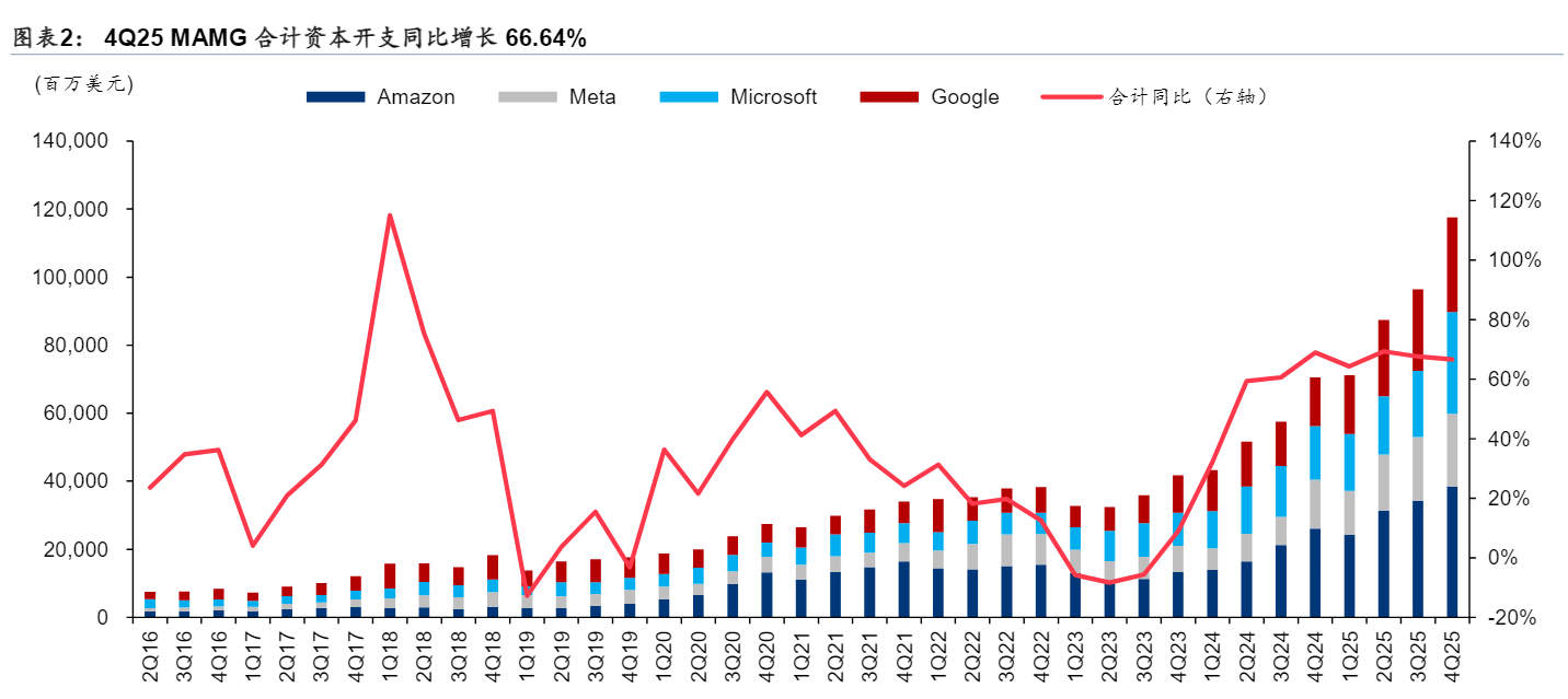 北美四大云厂商(MAMG,微软、亚马逊、Meta、谷歌)近日已发布25业绩,MAMG 25年合计资本开支同比增长67.06%至3725.52亿美元,Factset一致预期26年资本开支将达到5707.67亿美元(同比+53.2%)。各家保持对26年资本开支的积极指引:1)微软预计2026年全年的资本支出约为1152亿美元;2)亚马逊预计2026年全年的资本支出约为1613亿美元;3)Meta预计2026年全年的资本支出约为1237亿美元;4)谷歌预计2026年全年的资本支出约为1705亿美元。