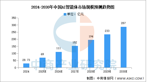 2024年中国智能体市场规模约为28.73亿元,未来AI发展势头强劲,预计2030年中国智能体市场规模将接近300亿元。